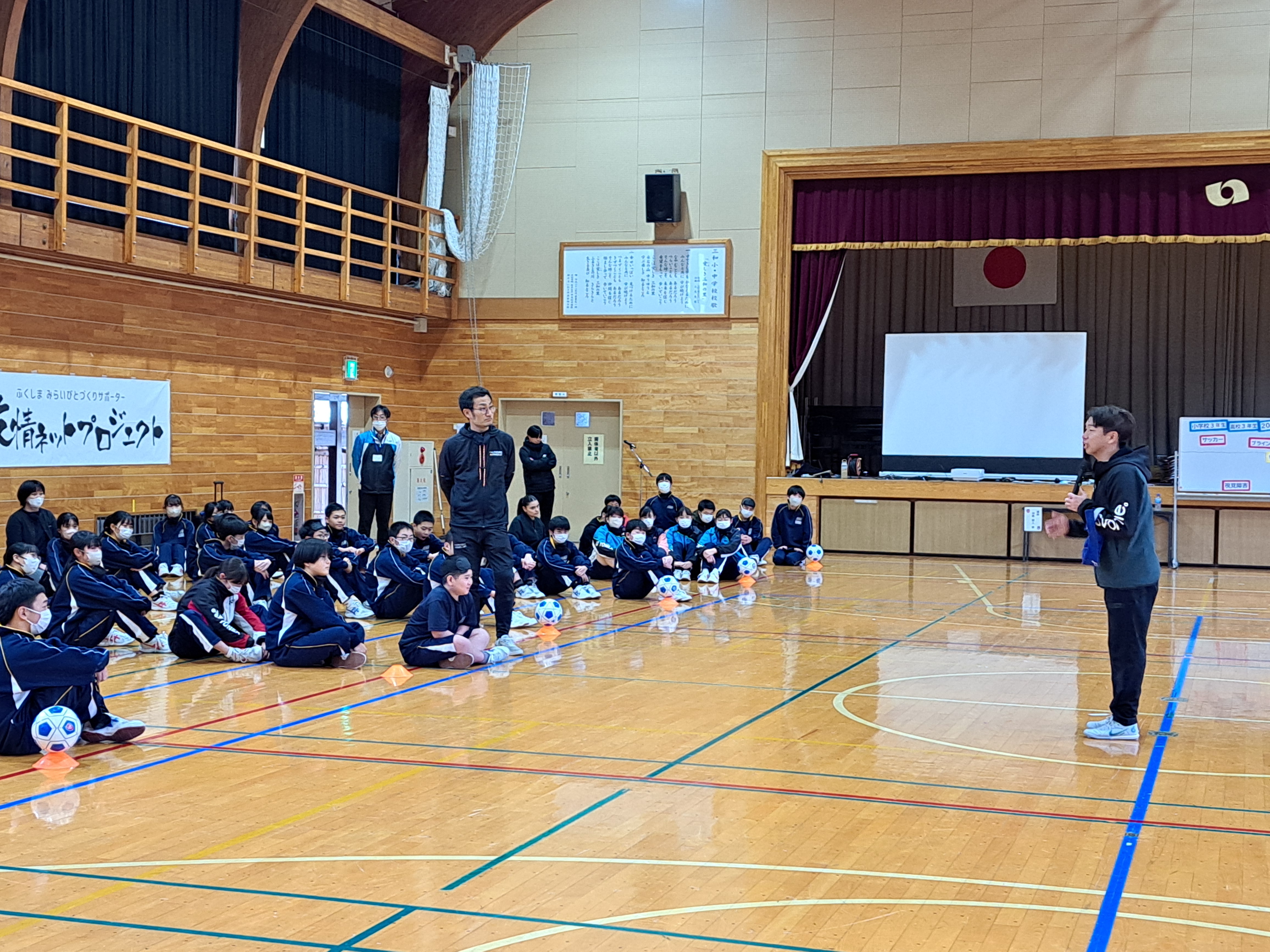 に迎え、講演会とブラインドサッカー体験会を開催しました。三和小学校 5・6 年生も