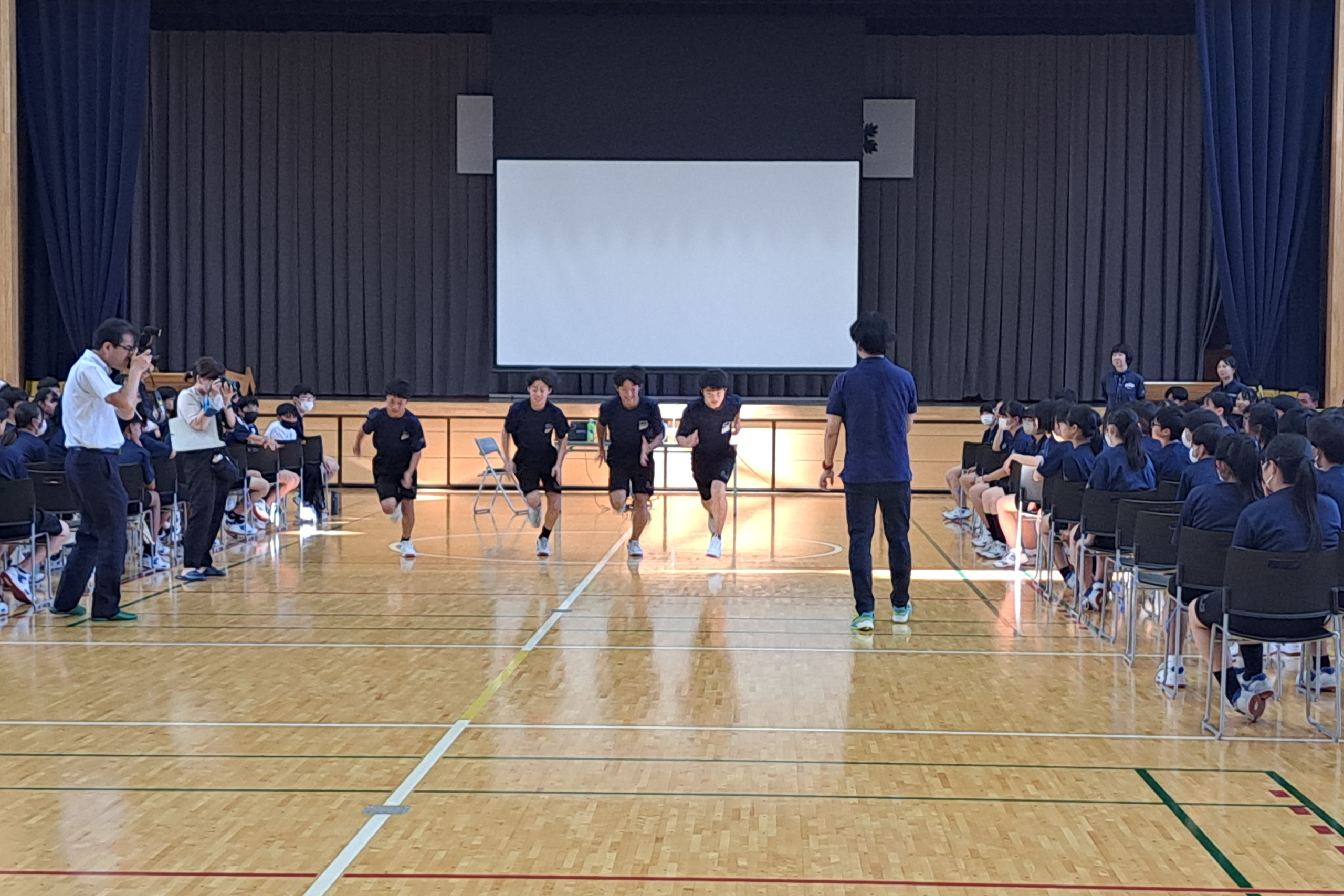 講演後には、陸上部の生徒さんを対象に、走り方教室を開催しました。